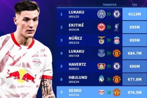 7、塞斯科(2025-26賽季RB萊比錫→曼聯(lián)),7650萬(wàn)歐元