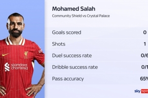 據(jù)天空體育統(tǒng)計(jì),薩拉赫本場比賽傳球成功率65%,所有非門將首發(fā)球員中最低,而且他在一周內(nèi)第二次罰丟點(diǎn)球。