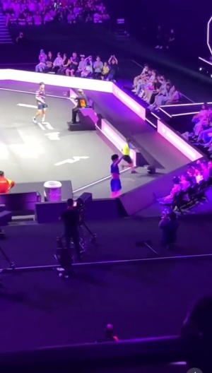 據(jù)現(xiàn)場(chǎng)觀眾拍攝的視頻,張本智和在賽后繞場(chǎng)慶祝并與兩位裁判握手,最后才走向王皓,此時(shí)王皓正在指導(dǎo)向鵬,王皓也看到了張本智和走來(lái),并先伸出手。
