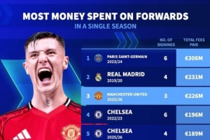 體育資訊8月11日訊 德轉統(tǒng)計了單一賽季鋒線引援費用榜單,曼聯(lián)今夏花2.26億歐引進3人排在第三位,巴黎、皇馬前二。