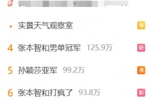 這6個(gè)微博熱搜分別為:王楚欽vs張本智和、王楚欽亞軍、張本智和男單冠軍、孫穎莎亞軍、張本智和打瘋了和張本智和醫(yī)療暫停。其中,微博熱搜第一為王楚欽vs張本智和。