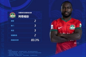 在本輪河南主場迎戰(zhàn)深圳新鵬城的比賽里,阿奇姆彭全場3腳打門全部射正、轉(zhuǎn)化成2個進球,幫助球隊4-1大勝對手。