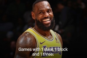 NBA歷史上僅有三位球員至少有350場常規(guī)賽單場砍下至少1蓋帽+1搶斷+1三分,他們分別是:詹姆斯(464)、杜蘭特(397)和哈登(361)。