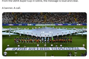 歐足聯(lián)官方在社交平臺(tái)上配文寫道:“來自烏迪內(nèi)的歐洲超級(jí)杯現(xiàn)場(chǎng),這則信息響亮且清晰,一面標(biāo)語,一次號(hào)召?!边@一標(biāo)語并沒有明確針對(duì)的對(duì)象,但歐足聯(lián)在活動(dòng)期間還邀請(qǐng)了兩名來自巴勒斯坦的難民兒童參加頒獎(jiǎng)儀式,指向性十分明確。