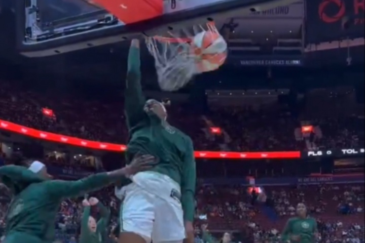 本場比賽賽前訓(xùn)練時,風(fēng)暴隊榜眼秀、法國1米98中鋒馬隆加輕松起飛完成扣籃。