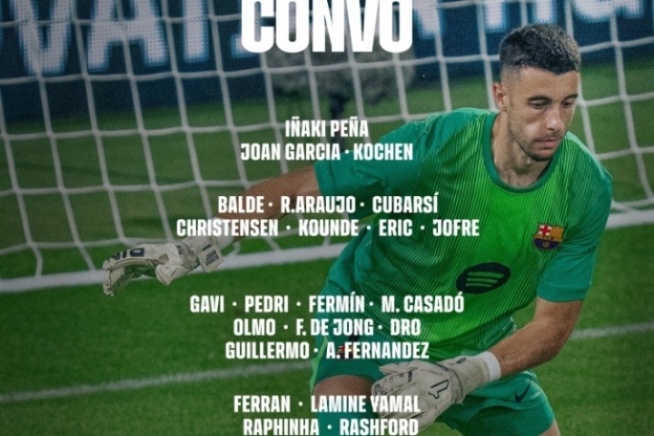 體育資訊08月16日訊 巴薩公布西甲首輪大名單,加西亞、拉什福德在列,無什琴斯尼萊萬。