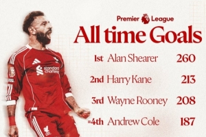 利物浦官方社媒曬出英超歷史射手榜,此役過后薩拉赫的英超進(jìn)球數(shù)達(dá)到187個,追平安迪-科爾并列第四。