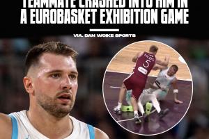 體育資訊08月17日訊 歐錦賽男籃熱身賽,斯洛文尼亞88-100不敵拉脫維亞,東契奇被隊友撞翻在地。