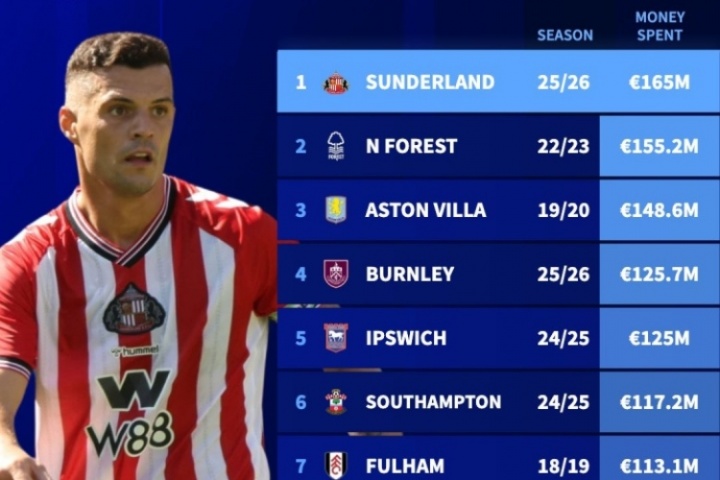 1.桑德蘭 25-26 1.65億歐