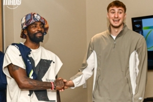 體育資訊6月28日訊 今天,獨(dú)行俠的雙狀元?dú)W文和弗拉格在飛翼和狂熱的比賽間歇會(huì)面。