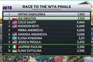 本站過后,WTA年終總決賽的積分也已經(jīng)更新,斯瓦泰克和薩巴倫卡鎖定年終總決賽名額。前8名入圍年終總決賽,保利尼和斯維托麗娜目前排在第9和第10。