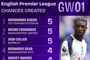 以下為英超首輪創(chuàng)造機(jī)會(huì)榜top10: