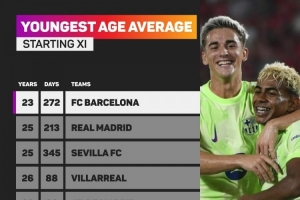 體育資訊8月20日訊 Opta統(tǒng)計了西甲首輪比賽各隊首發(fā)球員的平均年齡,并列出最年輕榜單,巴薩23歲272天居首,皇馬25歲213天次席。