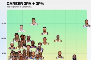 體育資訊8月21日訊 近日,數(shù)據(jù)媒體NBA University曬出一張NBA歷史上三分出手次數(shù)排名前55名的球員生涯三分命中率統(tǒng)計圖。