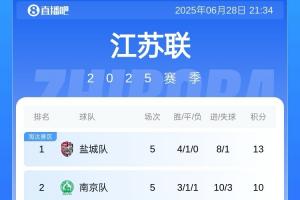 體育資訊06月28日訊 蘇超第五輪今日結束兩場比賽,連云港2-0戰(zhàn)勝淮安,終結3輪不勝。鹽城2-0戰(zhàn)勝鎮(zhèn)江,收獲3連勝。最新積分榜如圖。