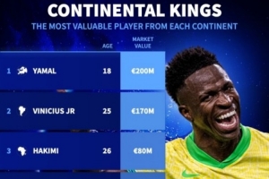 體育資訊8月23日訊 德國(guó)轉(zhuǎn)會(huì)市場(chǎng)列出了各大洲身價(jià)最高的球員,以及各大洲的球員總身價(jià)。