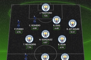 WhoScored根據(jù)球員上賽季至今的場均評分列出了曼城+熱刺陣容,哈蘭德、庫杜斯在列,熱刺僅3人入選。