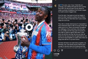 埃澤:五年光陰,恍如昨日。從我踏入水晶宮大門的那一刻起,你們給了我實(shí)現(xiàn)英超夢(mèng)想的機(jī)會(huì),讓我為南倫敦最大的俱樂部效力。從一開始,我就設(shè)定了目標(biāo),想要在這里有所成就,但從未想到這五年會(huì)如此精彩。