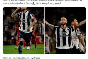 拉莫斯社媒曬出比賽照片,配文:“感覺真棒!在一場精彩的比賽中全取三分——榜首、零封和進球,在我們的球迷面前破門總是很開心,讓我們繼續(xù)加油!”
