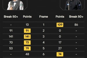 常冰玉打出一桿破百(141)和三桿50+(91、70、53),利亞姆·海菲爾德打出兩桿50+(86、70)。最終常冰玉以5-3的比分戰(zhàn)勝海菲爾德晉級32強(qiáng)。