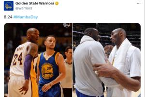 勇士官推曬出了庫里和科比、追夢和科比的合照,紀念曼巴日,并寫道:“8.24#曼巴日?!?/p>