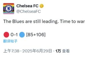 體育資訊06月29日訊 世俱杯1/8決賽,切爾西vs本菲卡,在經(jīng)歷了長達(dá)近兩個小時的中斷后,比賽終于將恢復(fù)進(jìn)行。切爾西官方也更新了比賽時間:85+106分鐘!