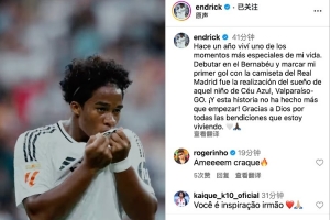 恩德里克社媒寫道:一年前,我經(jīng)歷了人生中最特別的時(shí)刻之一。 在伯納烏完成首秀,并打進(jìn)自己身穿皇馬球衣的首粒進(jìn)球,實(shí)現(xiàn)了那個(gè)來(lái)自巴西塞烏阿蘇(戈亞斯州瓦爾帕萊索)的孩子的夢(mèng)想。 這段故事才剛剛開始,感謝上帝賜予我正在經(jīng)歷的一切祝福。 ??????