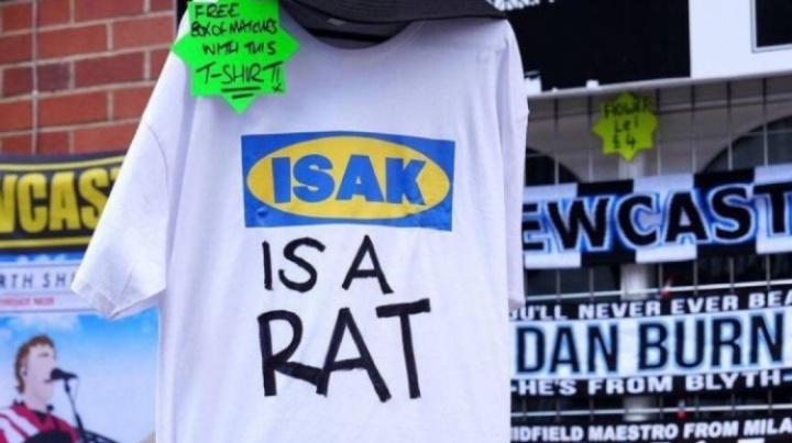 在利物浦對紐卡斯爾的比賽前,圣詹姆斯公園外有人在出售寫著“伊薩克是老鼠”的球衣??