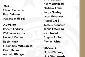 中場:阿德耶米(多特)、阿米里(美因茨)、格納布里(拜仁)、格雷茨卡(拜仁)、格羅斯(多特)、基米希(拜仁)、勒威林(斯圖加特)、內(nèi)布爾(美因茨)、斯蒂勒(斯圖加特)、維爾茨(利物浦)