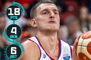 此役,塞爾維亞新星約維奇出戰(zhàn)三節(jié),登場15分51秒,投籃8中6,三分4中3,罰球3中3,得到18分4板6助1斷,正負(fù)值+36。