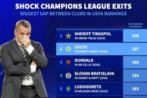 體育資訊8月28日訊 歐冠附加賽次回合,凱爾特人在點球大戰(zhàn)中不敵阿拉木圖凱拉特,目送對手隊史首次闖進歐冠正賽。根據德國轉會市場的統計,凱爾特人本次被淘汰是歐冠歷史交鋒兩隊歐足聯積分差距第二大。