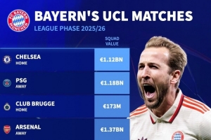本賽季歐冠拜仁對(duì)手身價(jià):