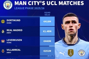 體育資訊8月29日訊 本賽季歐冠聯(lián)賽階段對陣抽簽結(jié)果出爐,德國轉(zhuǎn)會市場盤點了曼城對手的身價。