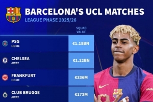 體育資訊8月29日訊 本賽季歐冠聯(lián)賽階段對陣抽簽結(jié)果出爐,德國轉(zhuǎn)會市場盤點了巴薩對手的身價。