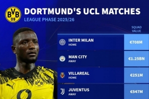 體育資訊8月29日訊 本賽季歐冠聯(lián)賽階段對陣抽簽結(jié)果出爐,德國轉(zhuǎn)會市場盤點(diǎn)了多特對手的身價。
