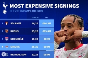 據(jù)德轉(zhuǎn)數(shù)據(jù)統(tǒng)計(jì),6000萬歐簽下西蒙斯是熱刺隊(duì)史第四貴引援。