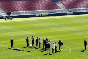 本周五,一張頗具超現(xiàn)實(shí)意味的照片在網(wǎng)絡(luò)上流傳開來。照片中,俱樂部主席拉波爾塔仰面躺在球場(chǎng)中央的草坪上。旁邊還有幾位攝影師和一位負(fù)責(zé)俱樂部社交媒體的工作人員,這可能是為了宣傳球隊(duì)在獲得相應(yīng)區(qū)域開放許可后重返主場(chǎng)的活動(dòng)。