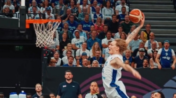 第四節(jié)比賽中,芬蘭18歲小將米卡-穆里寧貢獻(xiàn)一記帥氣扣籃——當(dāng)時(shí)穆里寧在防守回合帽掉對手,隨后馬上快下,接應(yīng)隊(duì)友的長傳球,騰空來了一個(gè)舒展的滑翔單臂暴扣。