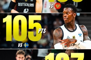 三場比賽德國分別是106-76擊敗黑山、105-83擊敗瑞典還有今天107-88擊敗立陶宛,三場比賽場均拿下106分,排在賽事第一。