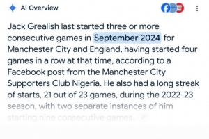 格拉利什通過社媒曬出了自己搜索自己上次連續(xù)3場首發(fā)的信息,顯示他上次連續(xù)3場首發(fā)還是2024年9月。他對此點(diǎn)評道:“終于又能連續(xù)3場首發(fā)的感覺真棒!”