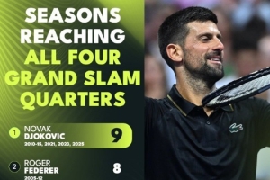 本賽季四大滿貫,德約科維奇全部打進(jìn)8強(qiáng),他單賽季9次四大滿貫均至少晉級(jí)八強(qiáng),超越費(fèi)德勒,成為歷史第一。