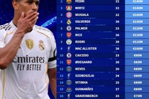 體育資訊6月29日訊 德轉(zhuǎn)盤點(diǎn)了目前世界足壇中場位置球員身價榜,其中貝林厄姆1.8億歐居首,具體榜單如下(身價相同年齡小者在先):