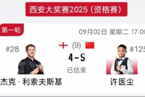 體育資訊9月2日訊 2025斯諾克西安大獎(jiǎng)賽,職業(yè)新人許醫(yī)塵5-4逆轉(zhuǎn)戰(zhàn)勝利索夫斯基。