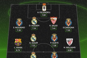 中場:亞馬爾(巴薩,8.74分)、居勒爾(皇馬,7.55分)、帕佩-蓋耶(黃潛,7.38分)、尼科-威廉姆斯(畢巴,8.08分)