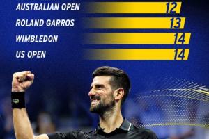 據(jù)統(tǒng)計,德約生涯一共53次晉級大滿貫四強,其中澳網(wǎng)12次、法網(wǎng)13次、溫網(wǎng)和美網(wǎng)均14次。