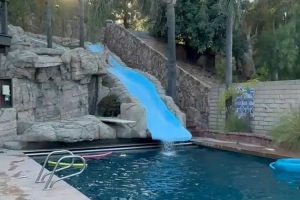 從視頻中可以看到,他從滑滑梯滑下的同時命中了一記超遠的投籃(上方視頻),而在第二個視頻(下方)中他在滑梯中失去平衡,上演了五大囧。