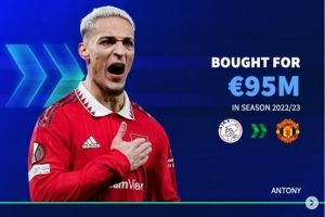 2022年夏窗,曼聯(lián)以9500萬歐元從阿賈克斯引進安東尼,今夏以2200萬歐將其賣給貝蒂斯。凈虧7300萬歐。