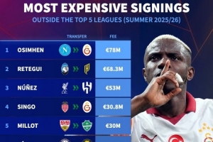 體育資訊9月4日訊 德國轉(zhuǎn)會市場列出了今夏五大聯(lián)賽之外球隊的最貴引援排名,奧斯梅恩居首,雷特吉次席。