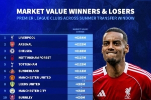 體育資訊9月4日訊 今年夏天,英超各俱樂部在單個轉(zhuǎn)會窗口的轉(zhuǎn)會費(fèi)支出創(chuàng)下了紀(jì)錄,高達(dá)35.9億歐元?!掇D(zhuǎn)會市場》也統(tǒng)計了經(jīng)過今夏(夏季轉(zhuǎn)會窗口被定義為為6月1日至9月2日,其中包括世俱杯的臨時轉(zhuǎn)會窗口)的轉(zhuǎn)會操作后各隊(duì)的總身價變化情況,利物浦、阿森納和切爾西分列前三,而桑德蘭的身價增幅最大、達(dá)到68.4%。