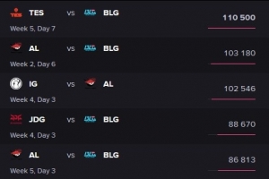 體育資訊9月5日訊 國外數據網站esports charts統(tǒng)計,LPL第三賽段常規(guī)賽在外網觀看前五的比賽分別是: